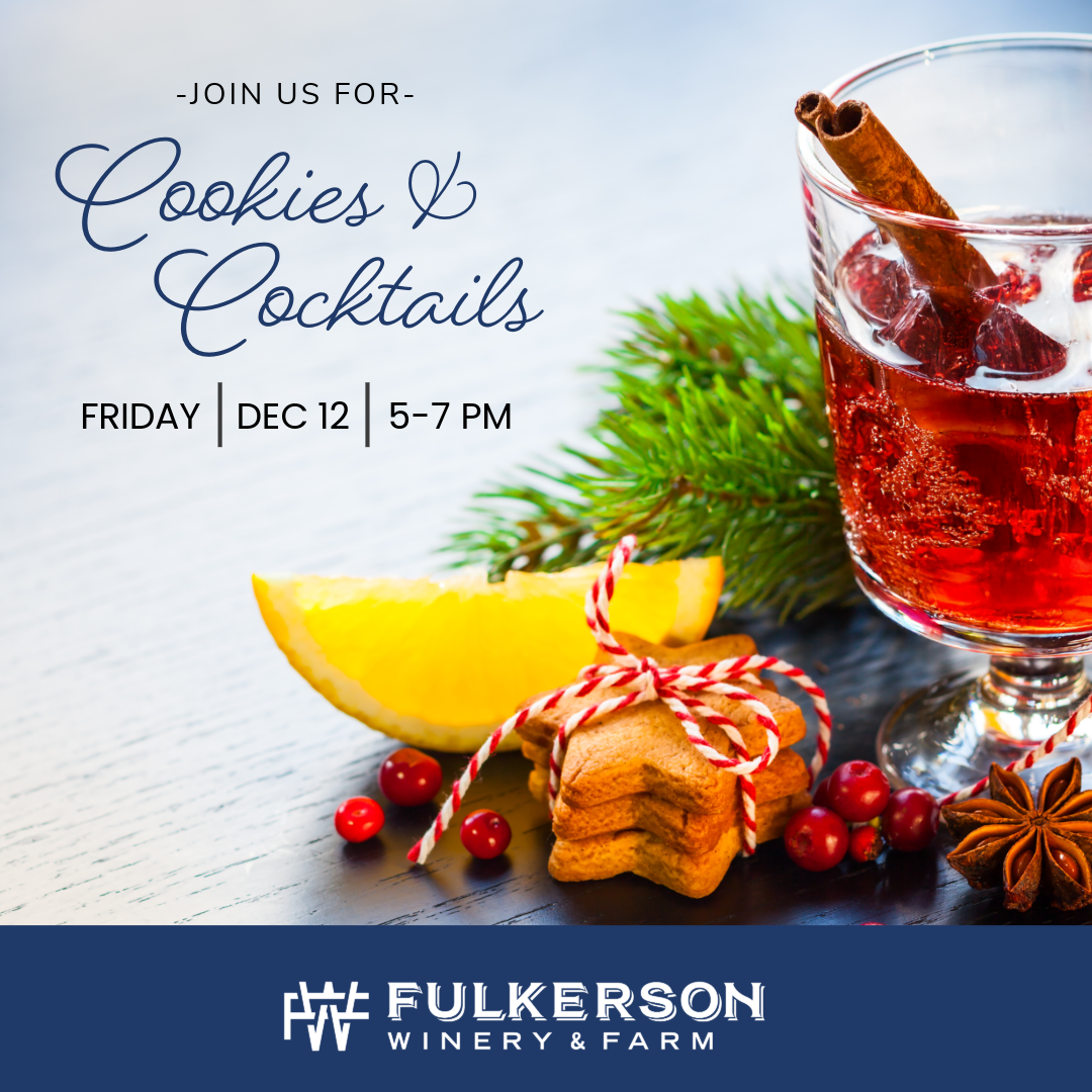 Stop by with family and friends to sample cookies and seasonal cocktails made from our sparkling wine and grape juice. Attendees can gather around the bonfire, share stories, and get the chance to shop for loved ones in the Fulkerson Gift Shop. Cookie plates to pair with your new favorite cocktails will be available for purchase.